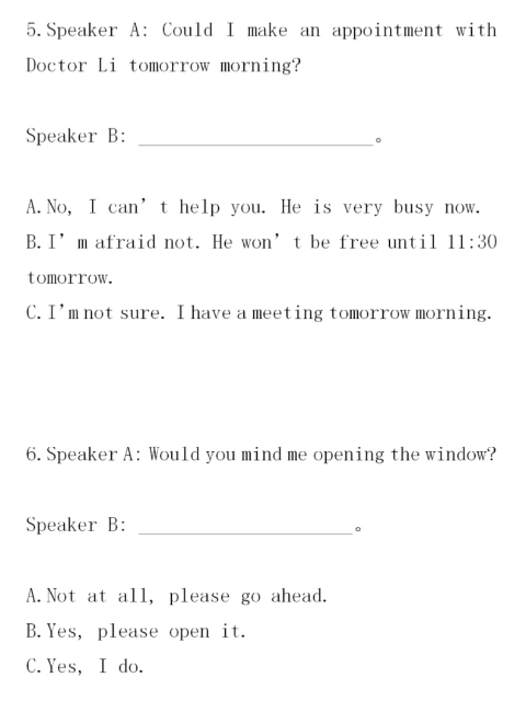 導讀:福建高職招考英語情景交際用語練習見下文,情景對話題不同于語法選擇題,語法上正確的、漢語上講得通的不一定是正確答案。情景對話的正確回答必須遵循“委婉、客氣、禮貌”的原則,被詢問者要根據實際情況作出回答。