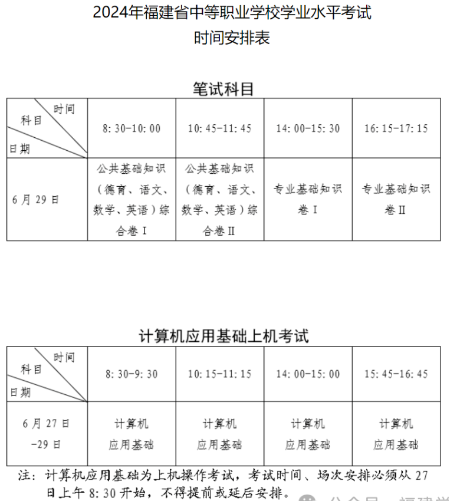 2024年福建分類考試中職學考具體考試內容及考試時間: