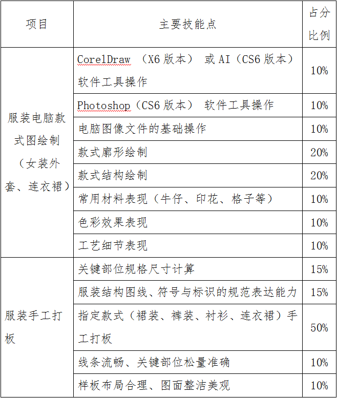 采用實踐考試形式(閉卷),包含兩個模塊測試,總分200分;其中:模塊一:服裝電腦款式圖繪制,滿分100分,考試時間120分鐘;模塊二:服裝手工打板(1:4比例),滿分100分,考試時間90分鐘。