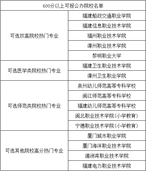 一、福建分類考試600分以上可報(bào)公辦院校名單: