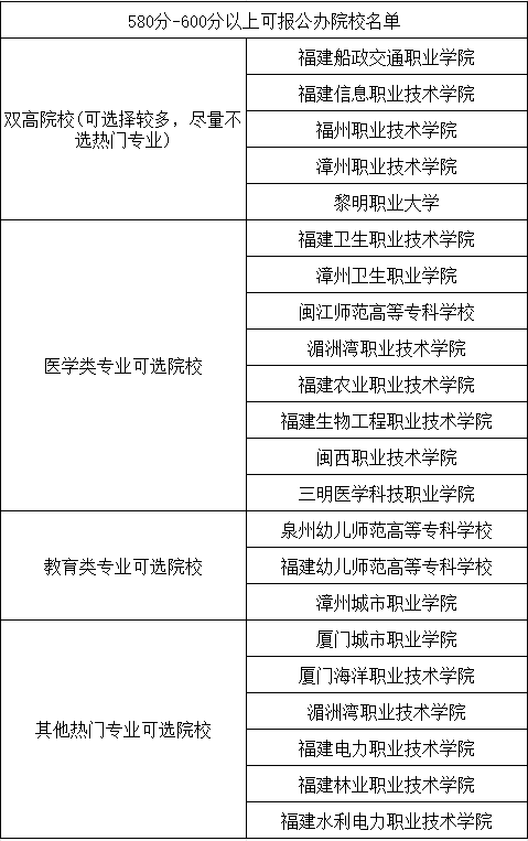 以下是福建高職分類考試網給大家整理分享的2023年福建分類考試580分-600分可報公辦院校名單,供大家參考!