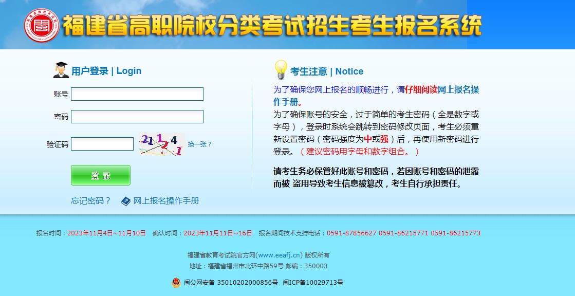 1、報考人員(含具有免試錄取資格人員,下同)于2023年11月4日至11月10日登錄福建省教育考試院網站“數字服務大廳-高職分類招考-高職分類招考考生報名系統”進行網上報名,逾期不予受理。