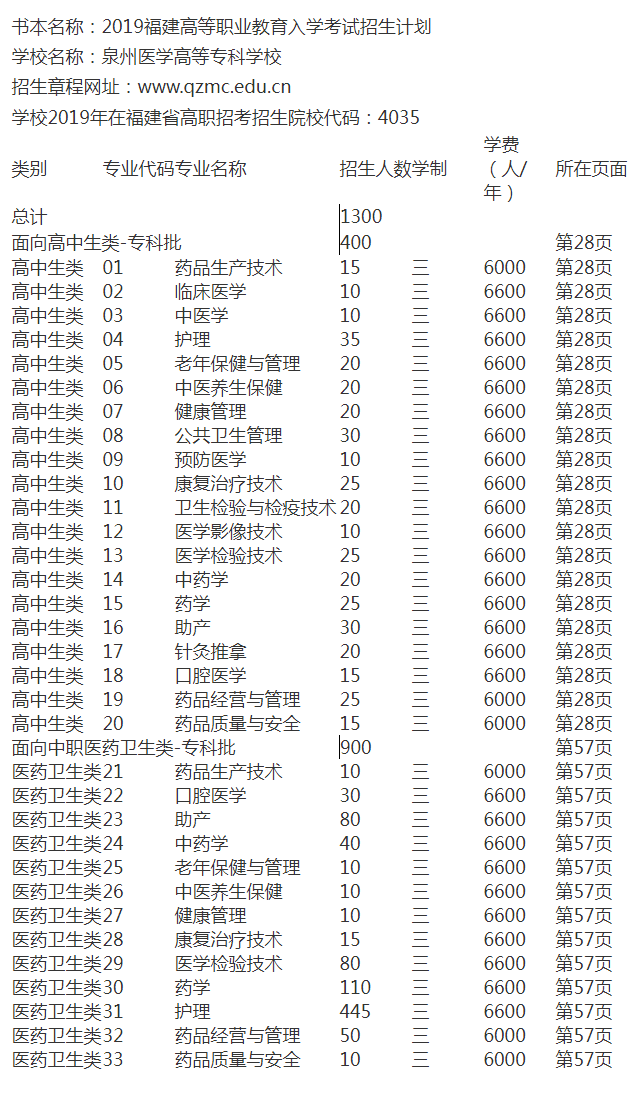 以上就是泉州醫學高等專科學校2019年高職招考招生計劃及代碼全部內容,更多關于福建高職分類考試的相關內容,如于福建高職報考條件、報名時間、考試科目、于福建高職成績查詢、分數線等敬請關注福建高職分類考試網。