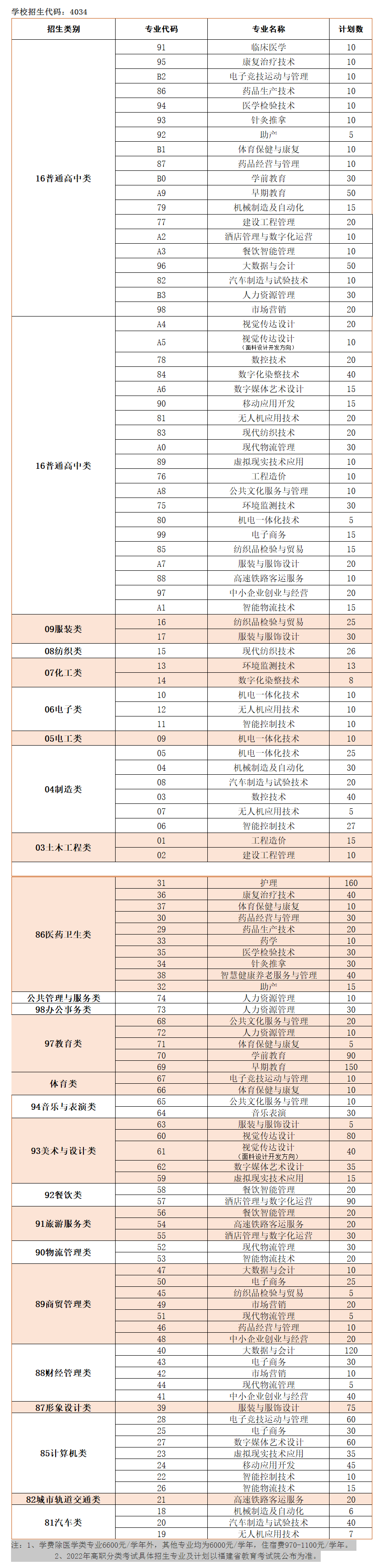 三明醫學科技職業學院2022年高職院校分類考試分專業招生計劃
